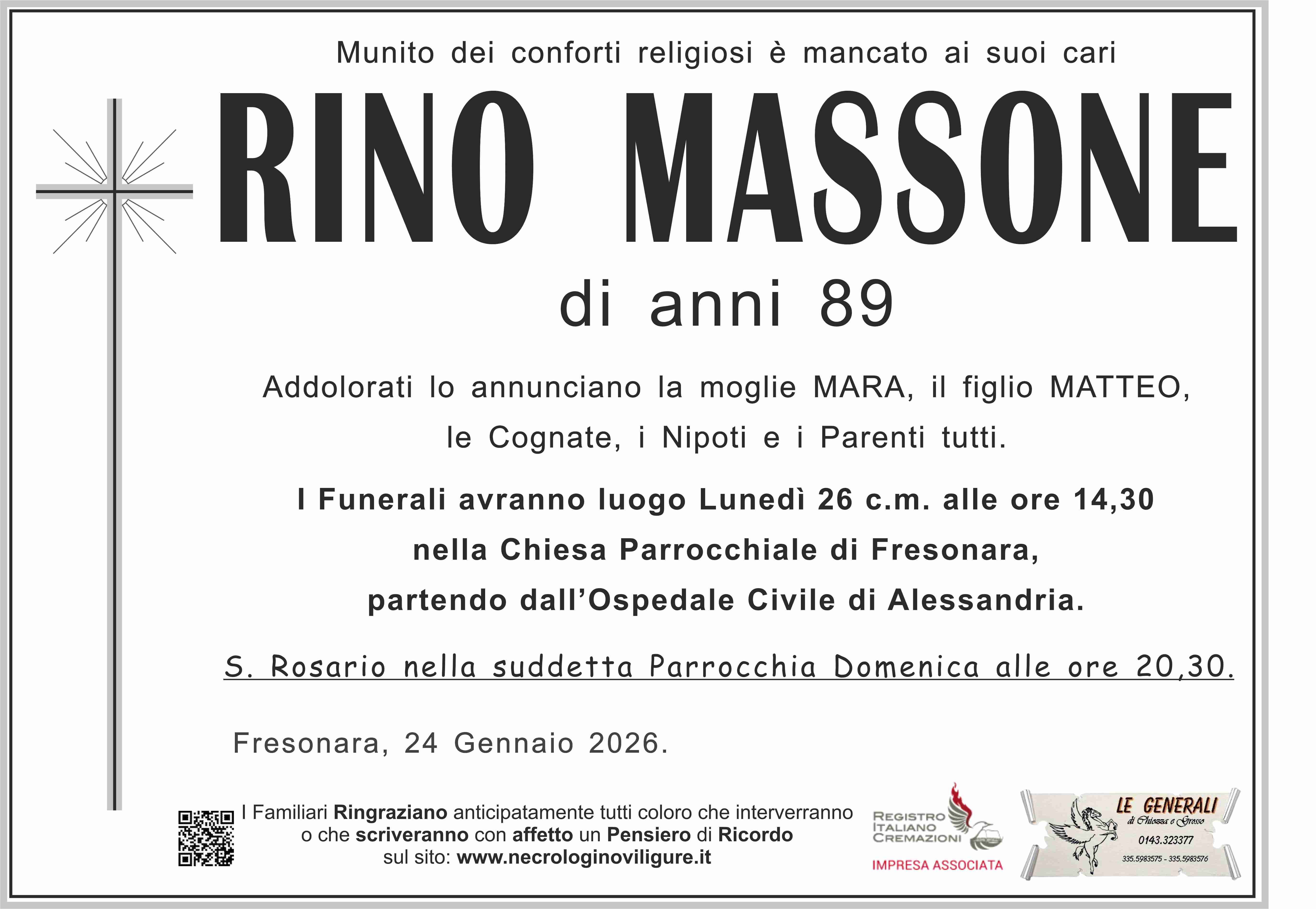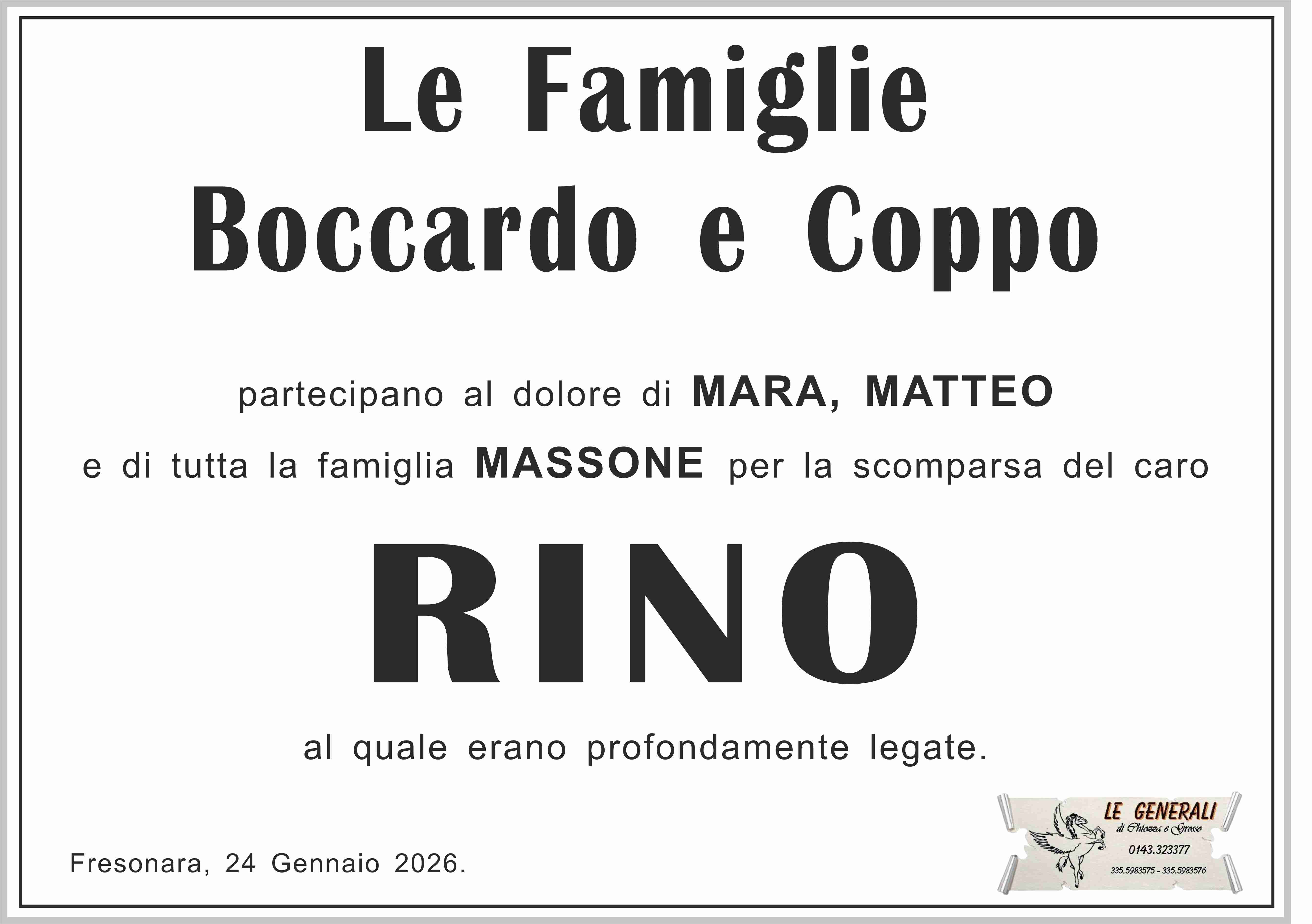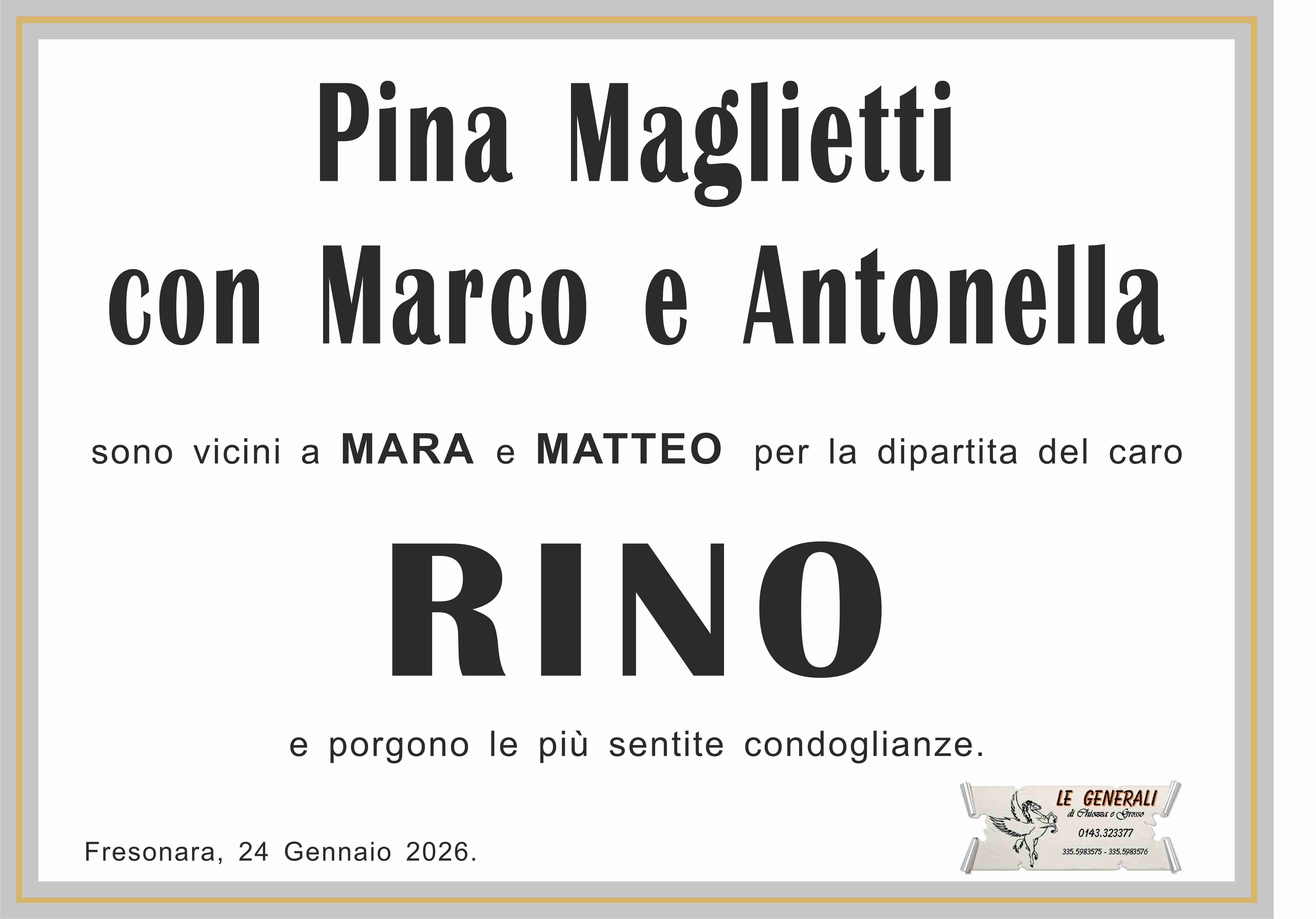 I familiari ringraziano anticipatamente tutti coloro che parteciperanno alla cerimonia funebre e tutti coloro che scriveranno con affetto un Pensiero di Ricordo.