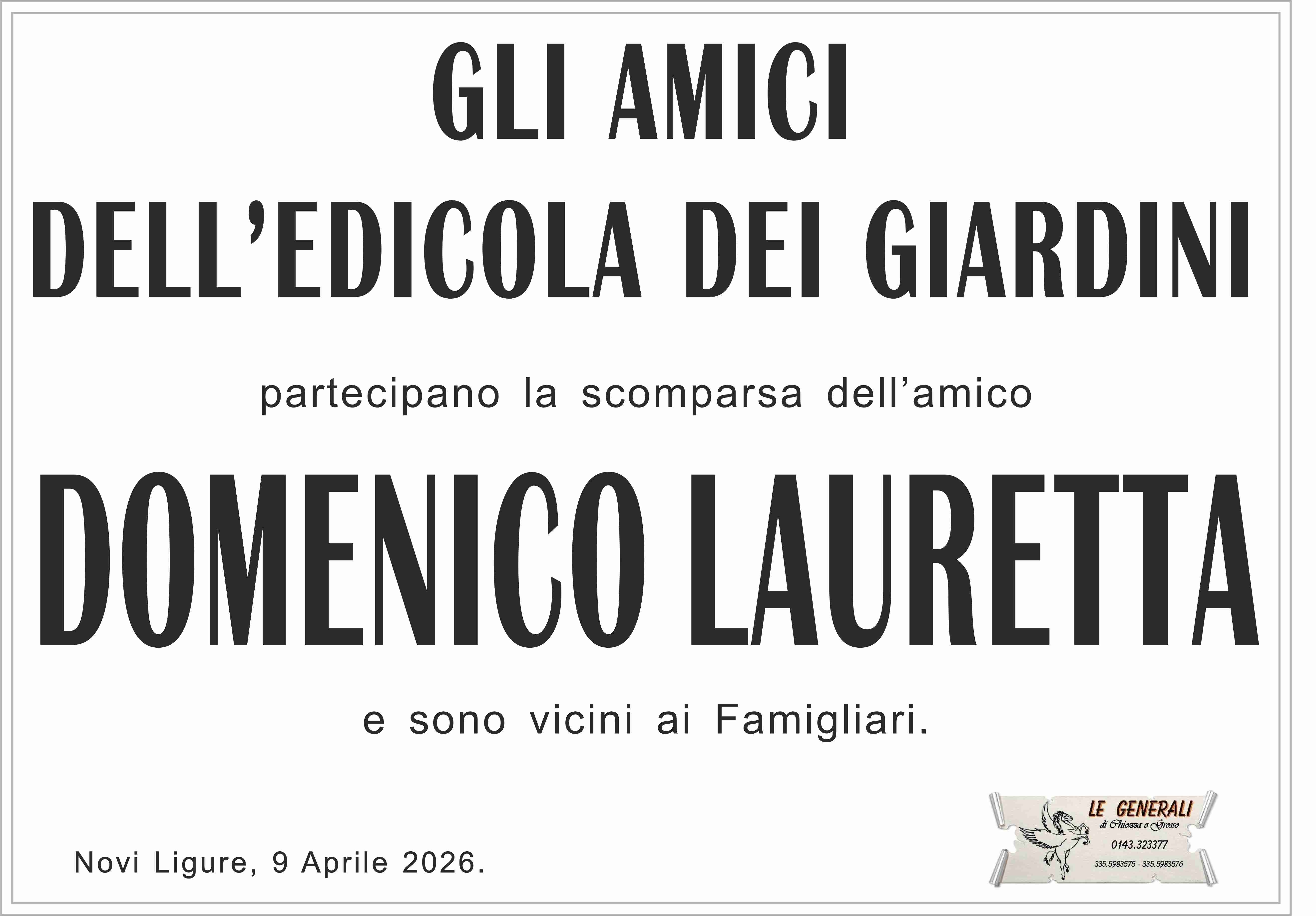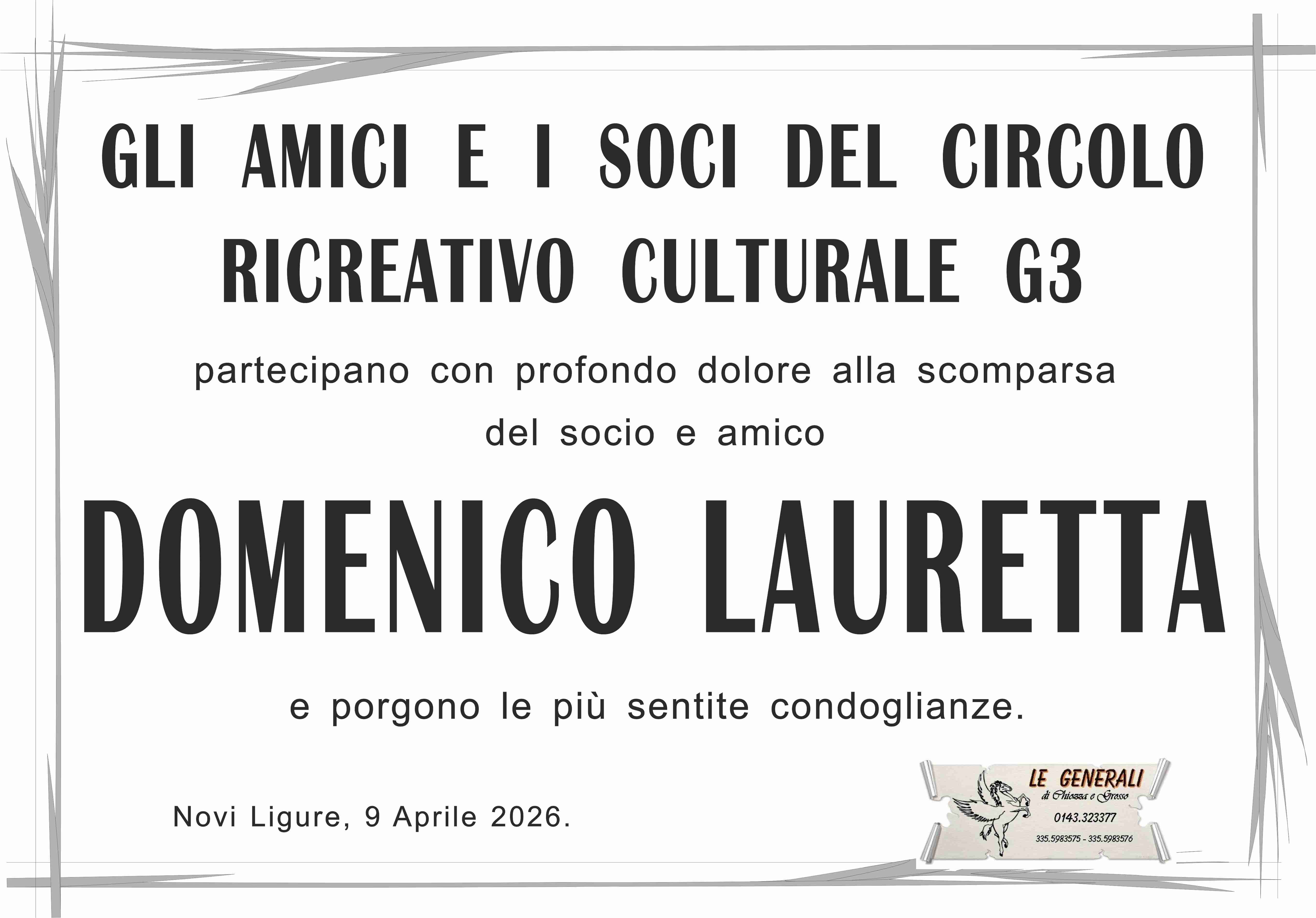 Caro Domenico, ci incontravamo tutte le mattine in Via Garibaldi per raccontarci le ultime, con la battuta " mi e ti' e ti' e mi' e tegnimu è " con grande dispiacere e stima di una bella persona porgo sentite condoglianze alla signora Marisa, Claudio e famigliari, Giusti Santo e M. Luisa