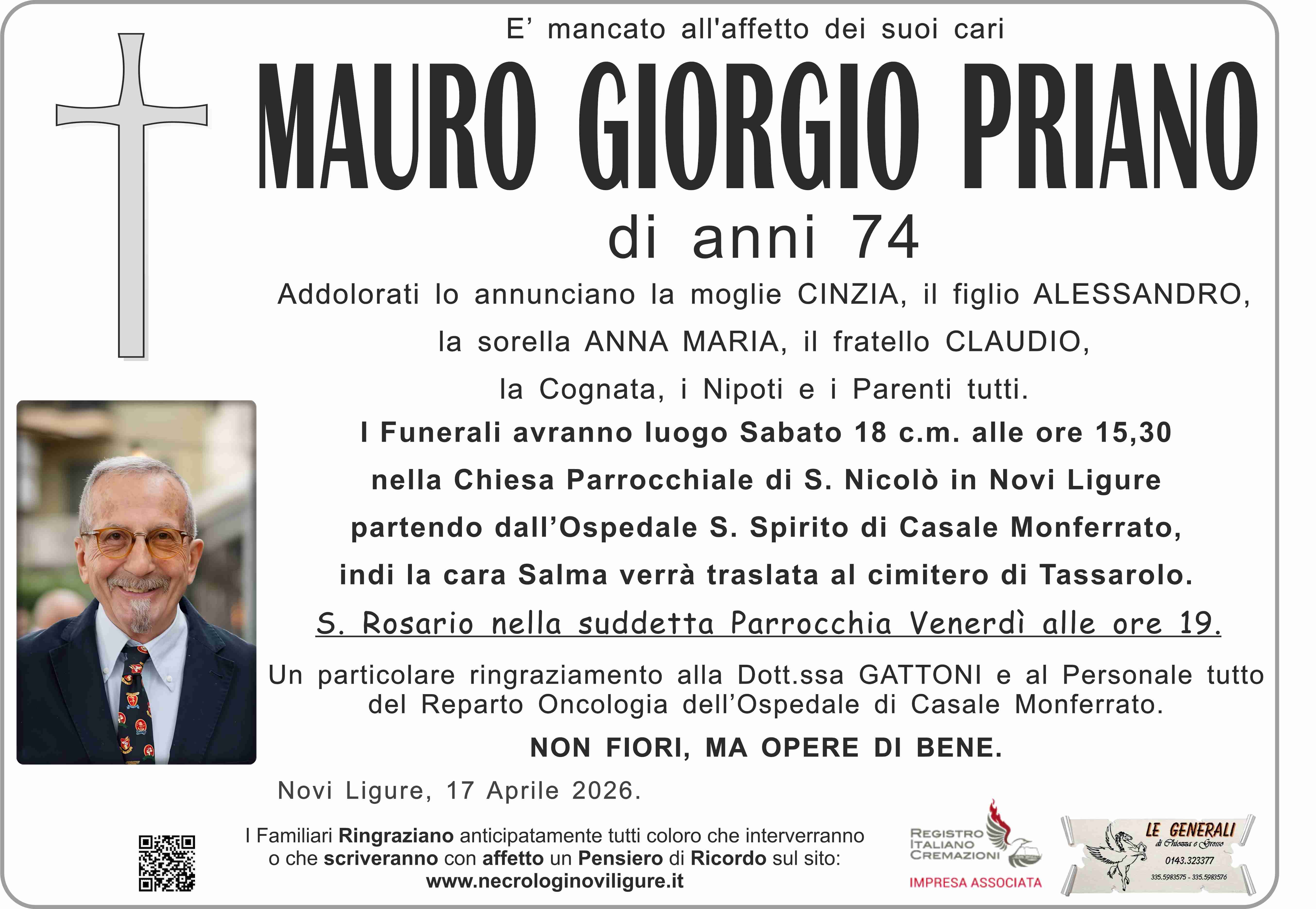 I familiari ringraziano anticipatamente tutti coloro che parteciperanno alla cerimonia funebre e tutti coloro che scriveranno con affetto un Pensiero di Ricordo.