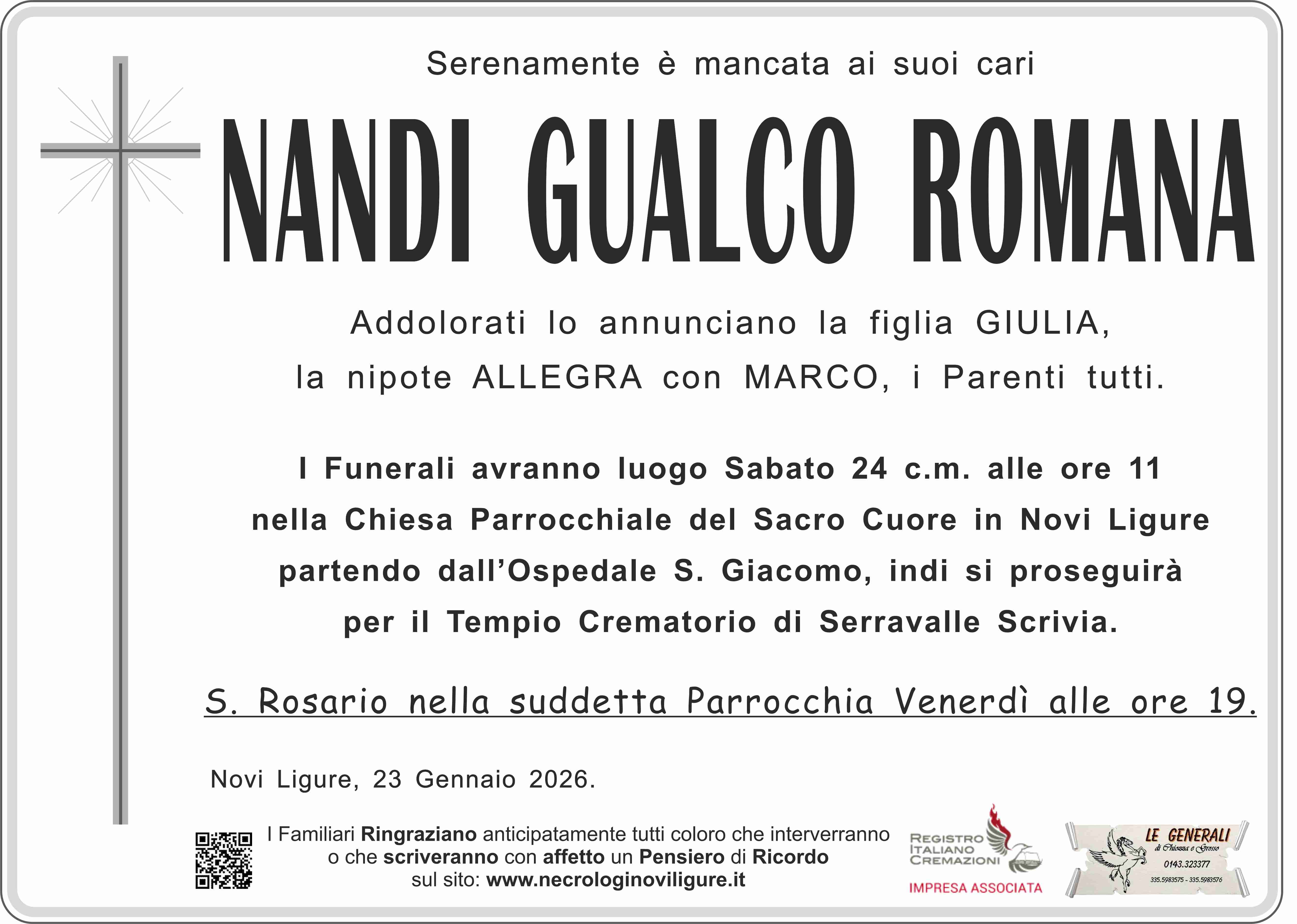 I familiari ringraziano anticipatamente tutti coloro che parteciperanno alla cerimonia funebre e tutti coloro che scriveranno con affetto un Pensiero di Ricordo.